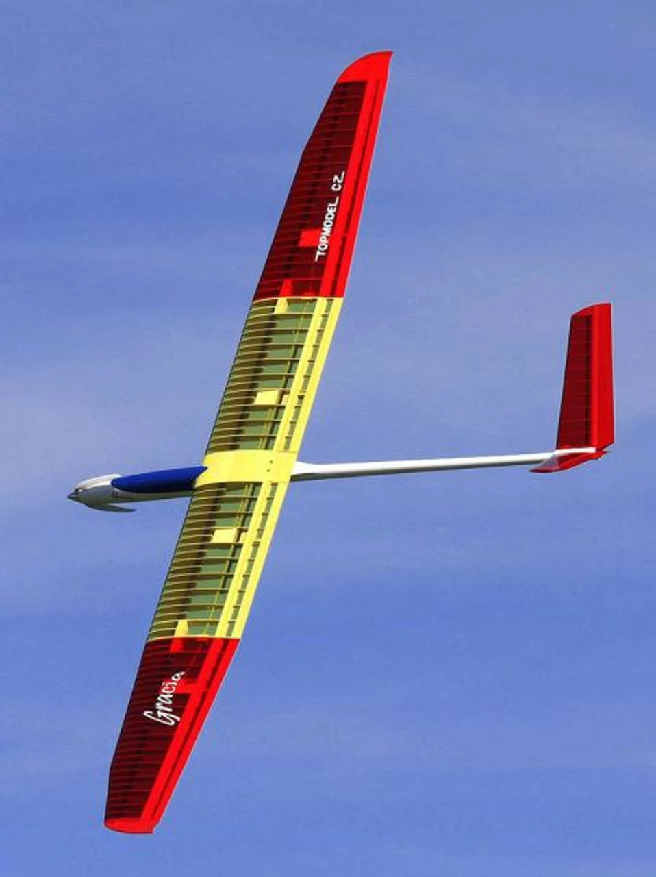 The wing spars and leading edge from carbon fibre gives the wing enough strength and stiffness. Many expert pilots will be particularly surprised by its excellent flight qualities, given by the thin wing airfoil and weak weight. Thanks to the long fuselage, the model has a calm and steady glide path.There are several possibilities how to mix the functions of the flaps (high performance thermal soaring, spot landing etc.). With the recommended gear train set, the performances are fantastics as well as when climbing (power) as soaring (lightness) and the flying time is counted in hours rather than in minutes!