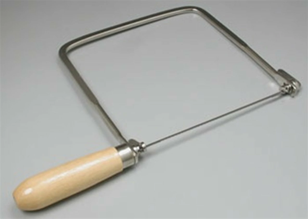 - Flat wire frame that allows standard pin end coping saw blades to be tensioned for complete control in precise cutting of wood, plastic and metal.